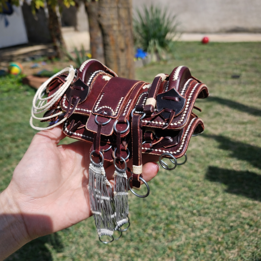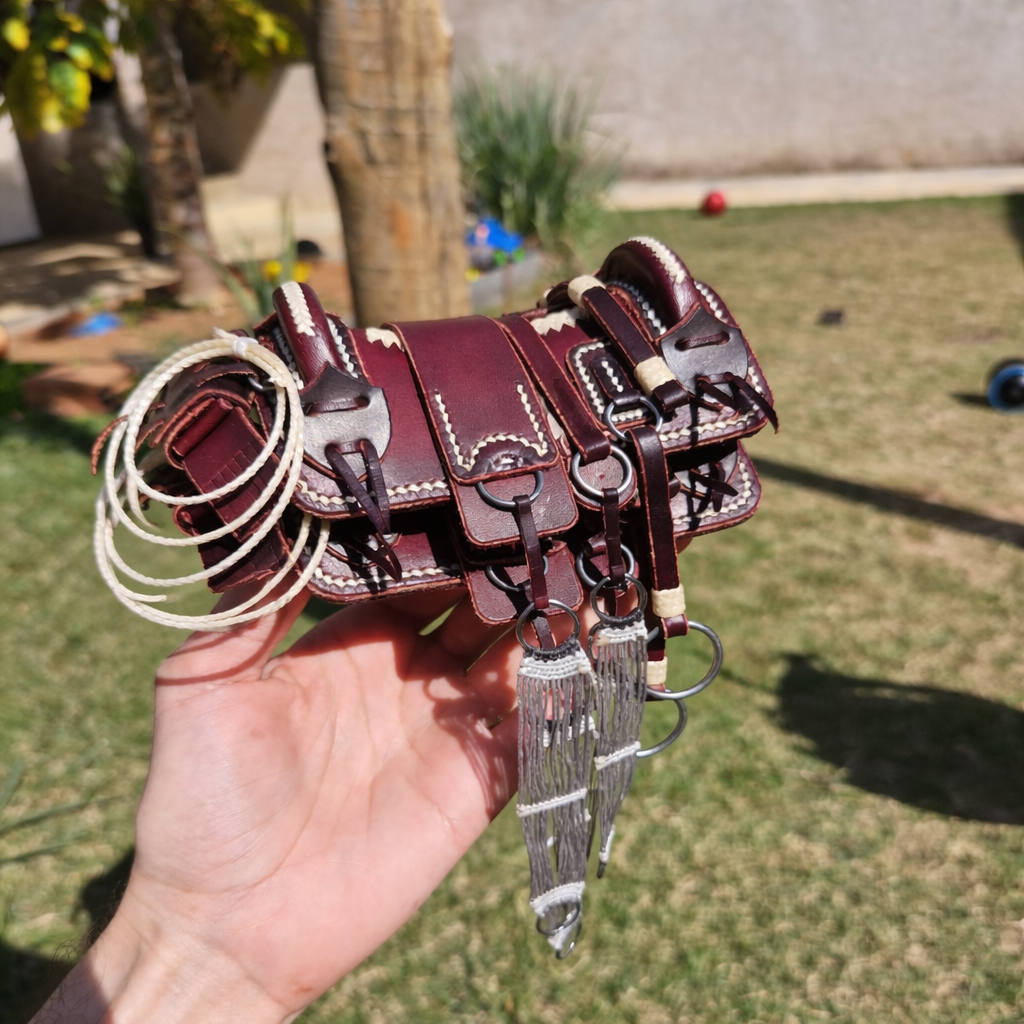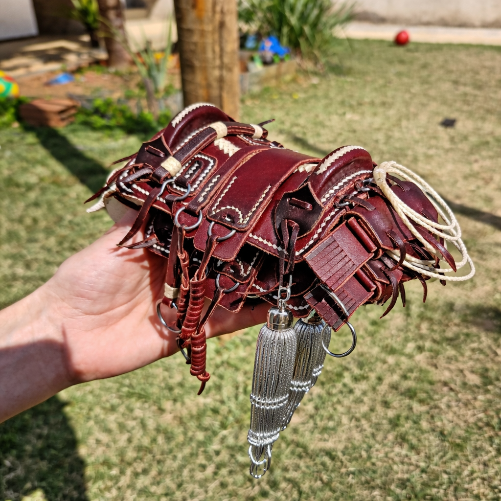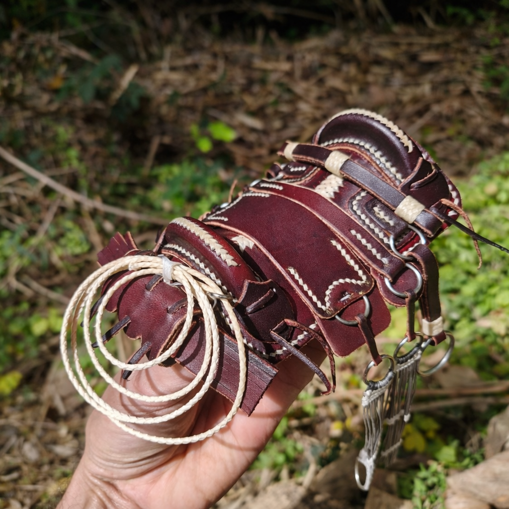 Essa miniatura é uma réplica fiel de um arreio banana completo, feita à mão, usando couro legítimo de primeira linha, ferragens e acabamento no padrão de quem trabalha com sela e arreio de verdade.