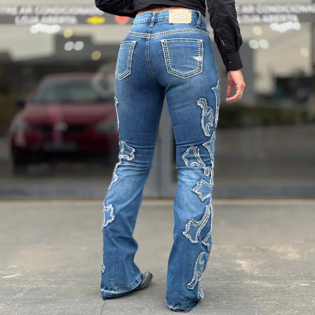 Confeccionada em jeans premium, com lavagem artesanal em azul médio e barra desfeita, é uma peça autêntica e cheia de personalidade. Ideal para rodeios, festas country e também para o dia a dia da cowgirl que busca qualidade e beleza em um só jeans.